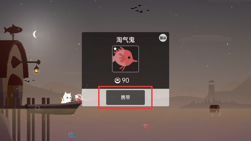 4、钓到【淘气鬼】鱼后,点击【携带】按钮收集该鱼,用于丰富鱼缸或出售攒资金。