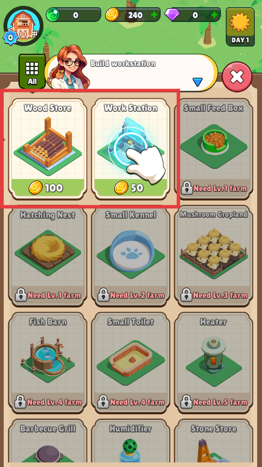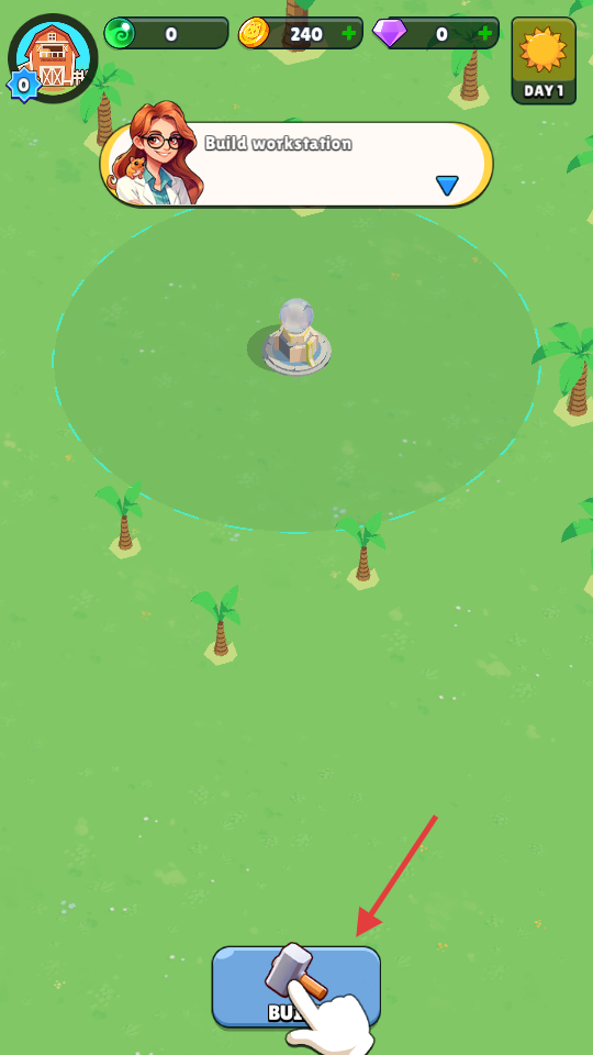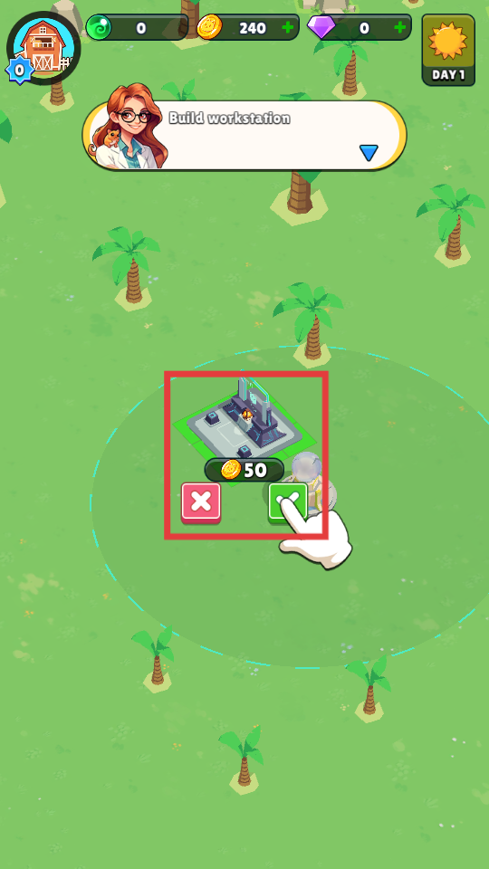 4、确认建筑位置后,点击绿色对勾按钮,花费50金币完成【WorkStation】的建造。