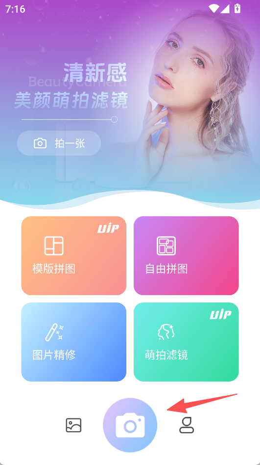 1、打开软件,点击“拍一张”可直接拍摄,也可选择模版拼图、自由拼图等功能。