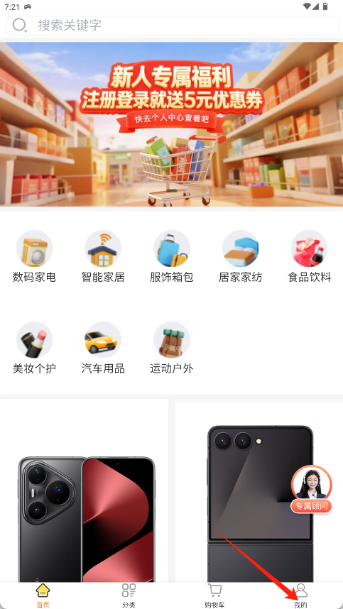 1、在应用首页浏览商品分类后点击底部导航栏的“我的”按钮。