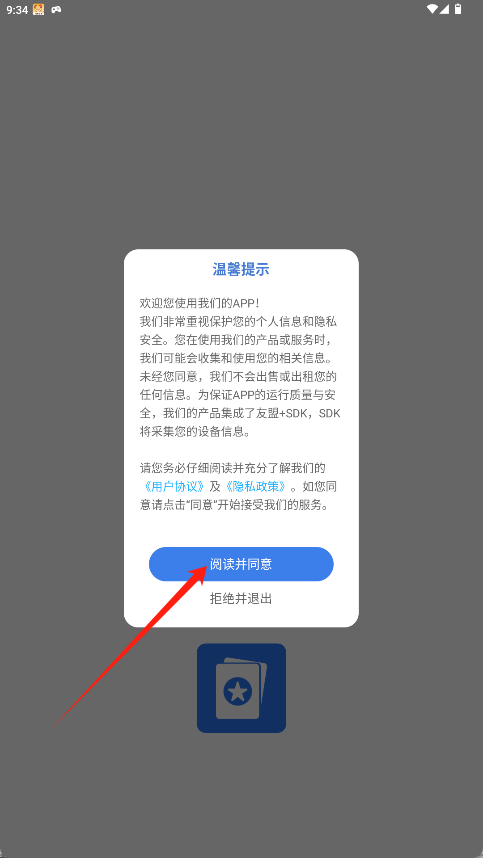 1、在隐私政策弹窗界面,点击顶部“阅读并同意”按钮。
