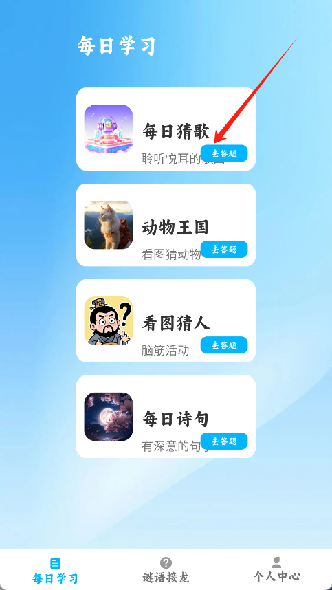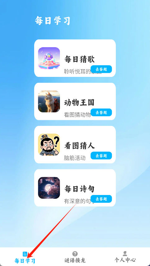 2、在“每日学习”页面中,根据兴趣点任一主题卡片,如“每日猜歌”。