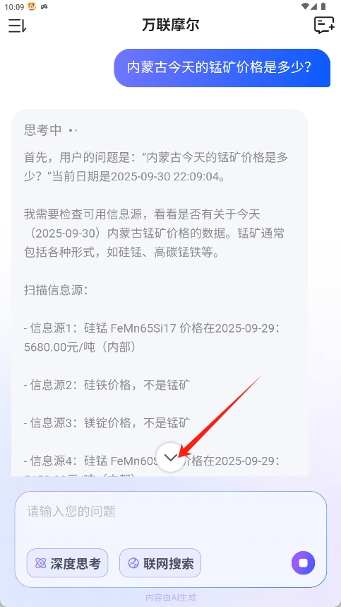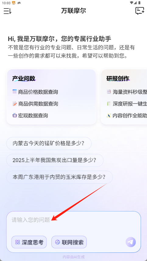 2、进入首页后,在底部输入框键入问题,如“内蒙古今天的锰矿价格是多少?”。