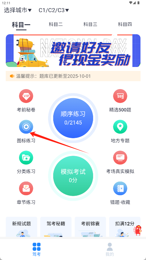2、进入科目一主界面,在功能区域选择如“图标练习”等具体学习模块。