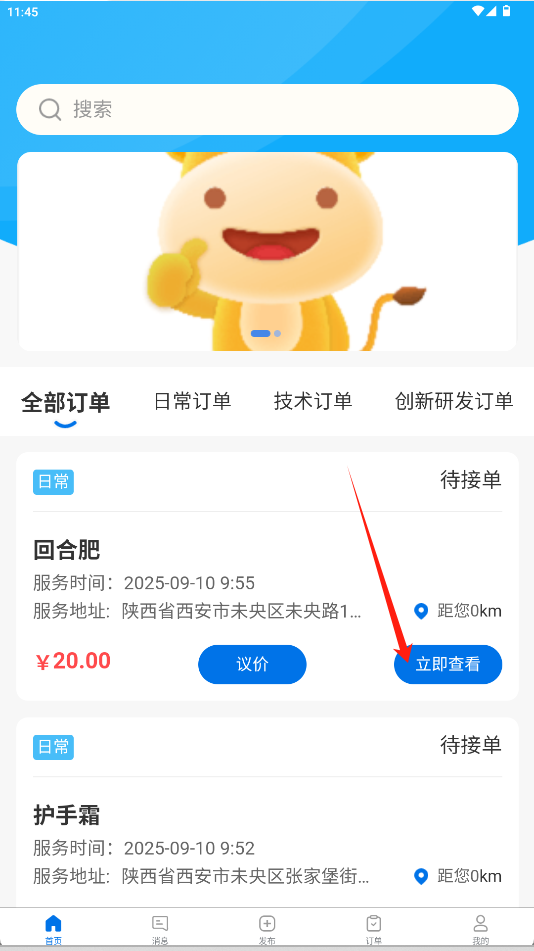 3、成功登录后,在“订单”页面浏览待接单任务,点击右侧的“立即查看”按钮处理。