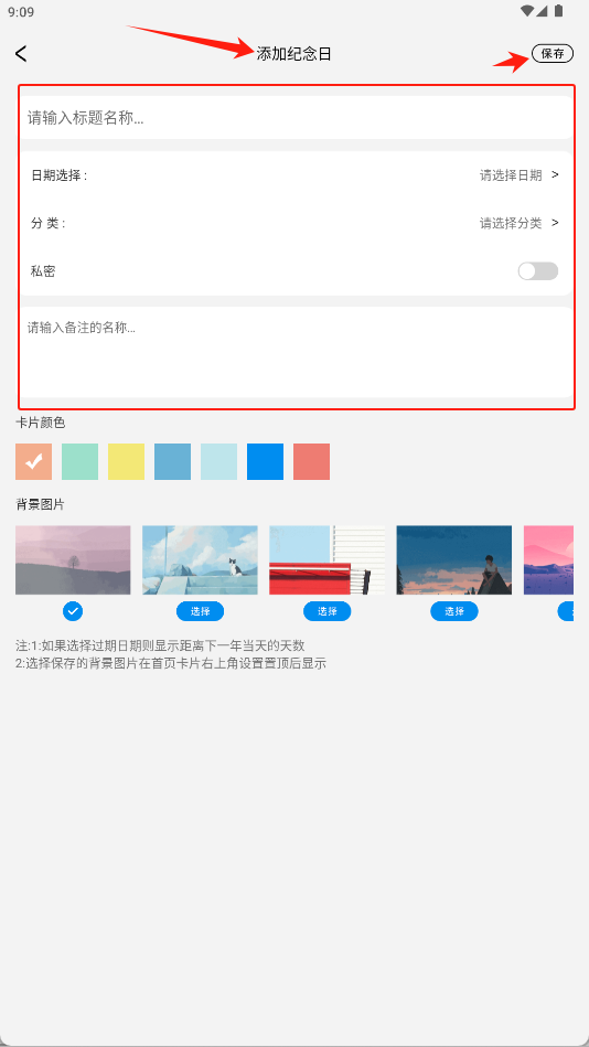 3、填写标题、日期等信息并选择样式后点击保存即可生成倒计时卡片。