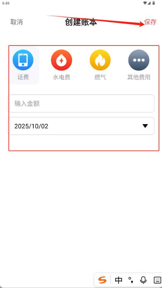 3、在创建账本界面填写金额与日期等信息,点击顶部的“保存”按钮完成记录。