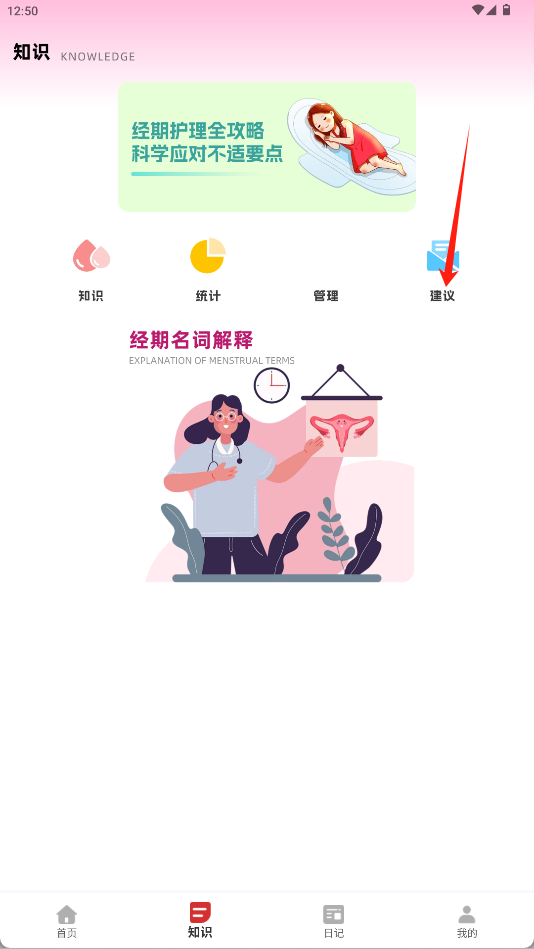 1、在《女性日记》首页底部导航栏点击“知识”功能图标。