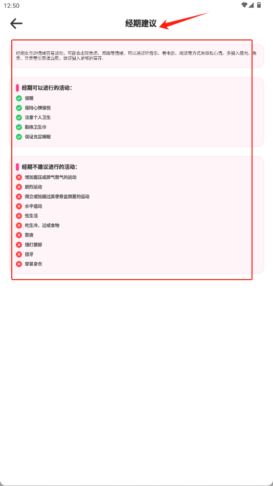 3、页面跳转至经期建议详情、可查看具体注意事项与推荐活动等科普内容。