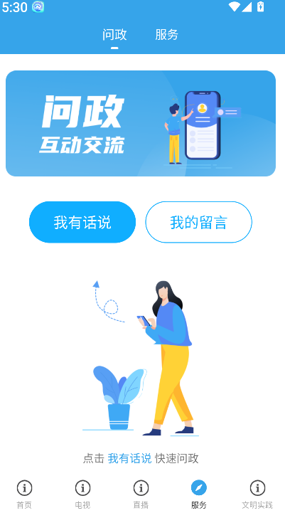 4、在“问政服务”板块,可以进入“我有话说”,进行留言反馈,与政务服务形成互动,表达意见与建议。