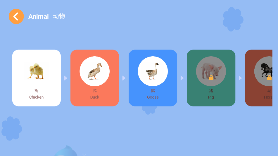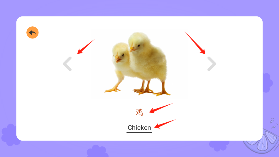 3、在页面中,会自动语音播放动物的名称,点击下方的单词会发出英文的名称,点击左右两边的按钮,可以切换不同的动物。