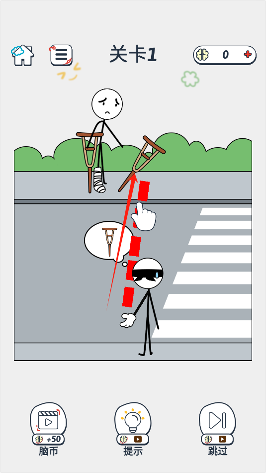 2、关卡1,点击滑动火柴人的手,伸过去把拐杖偷走。