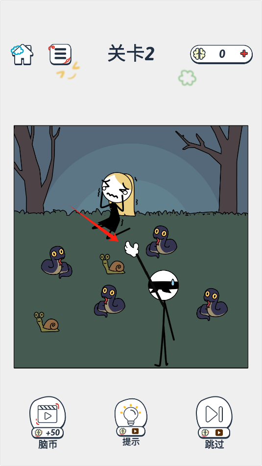 3、关卡2,点击滑动火柴人的手,避开女孩两边的蛇和蜗牛,把女孩救出去。