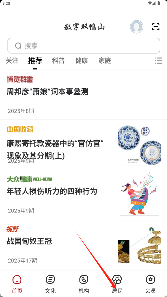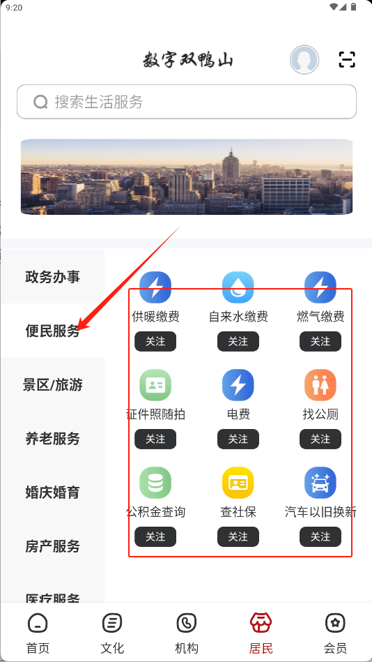 2、在底部导航栏中,选择并点击“居民”选项,进入服务主页面。