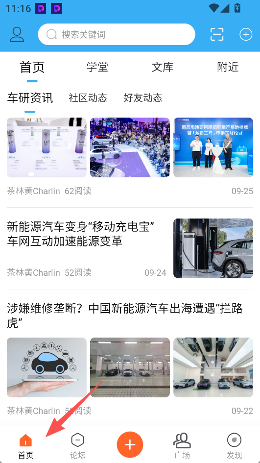 1、打开车研圈,点击底部“首页”,浏览车研资讯、社区动态。