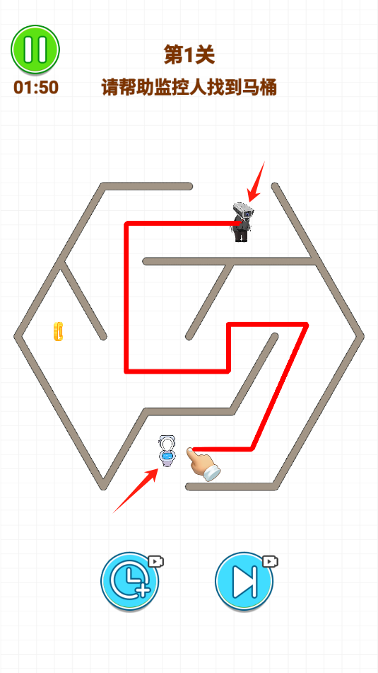 3、游戏中,需给马桶人画一条路线,最终找到厕所。