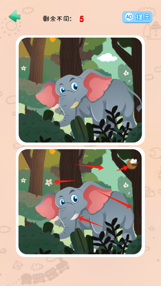 3、游戏中,对比上下两图,找出剩余不同的5处地方即可。