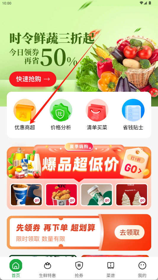 2、首页中找到“优惠商超”功能点击进入下一步。