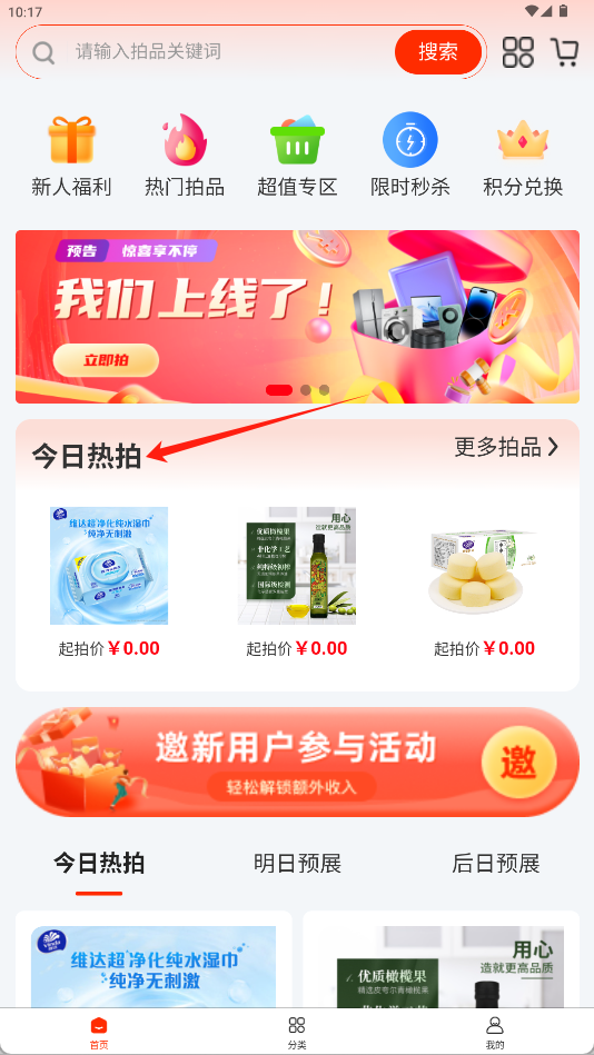 2、进入首页后点击“新人福利”或“今日热拍”浏览0元起拍商品。