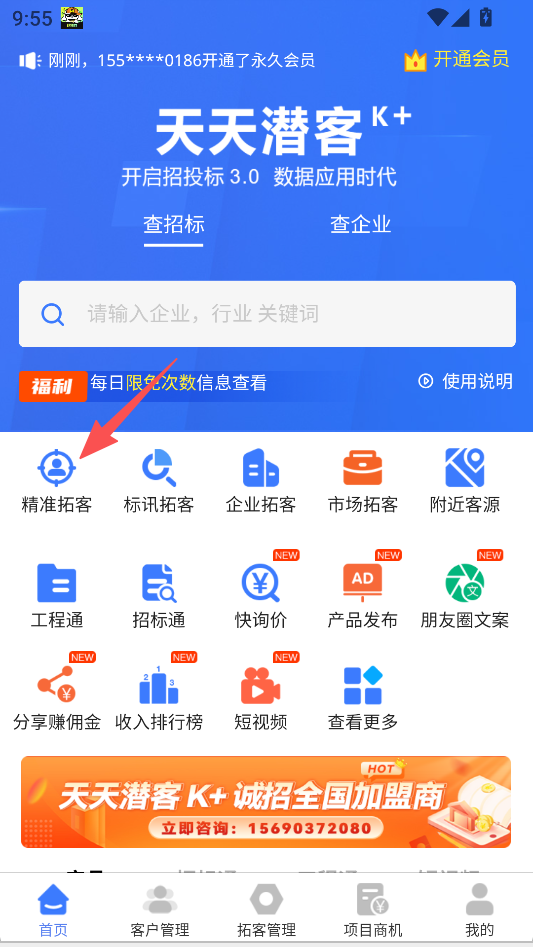 1、聚焦招投标与拓客领域,将查招标、查企业、多种拓客方式等功能融合,为相关工作提供综合服务平台。