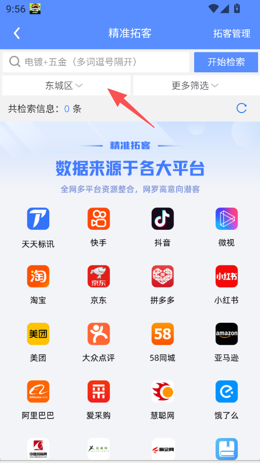 1、点击“精准拓客”,输入关键词并筛选,可整合多平台数据找目标客户。