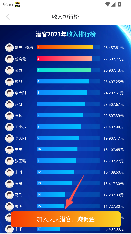 3、设有收入排行榜,可查看他人收益情况,还能参与“加入天天潜客,赚佣金”活动获取收益。