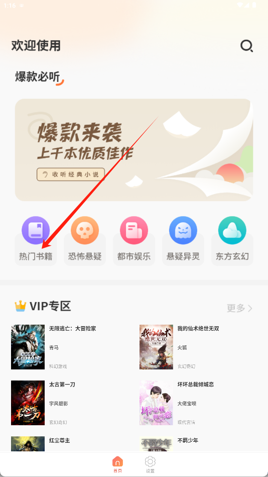 1、在首页点击指向的“热门书籍”分类图标进入书籍列表页。