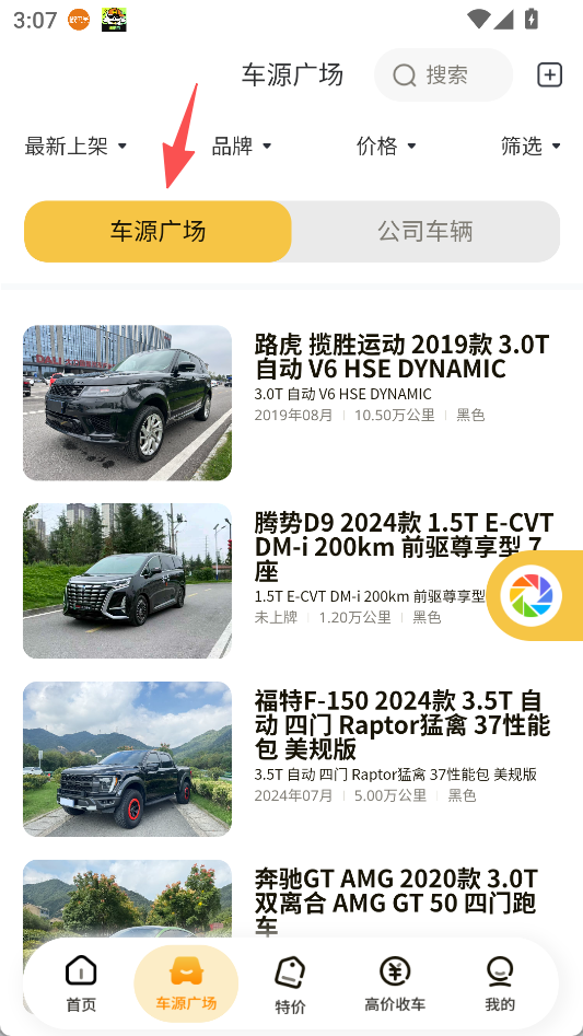 1、打开软件,进入车源广场,可查看展示的各类车辆信息。