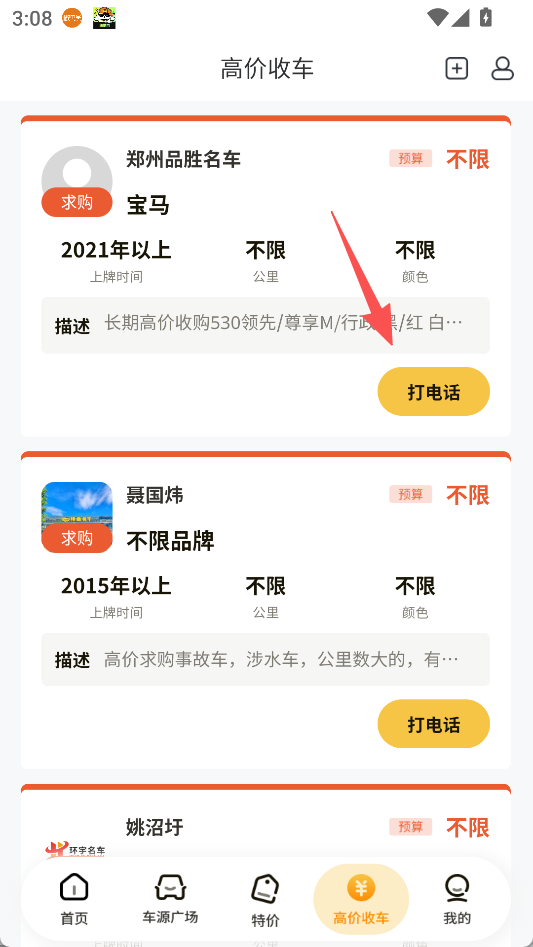 2、进入高价收车板块,看到收车需求后,可点击打电话联系。