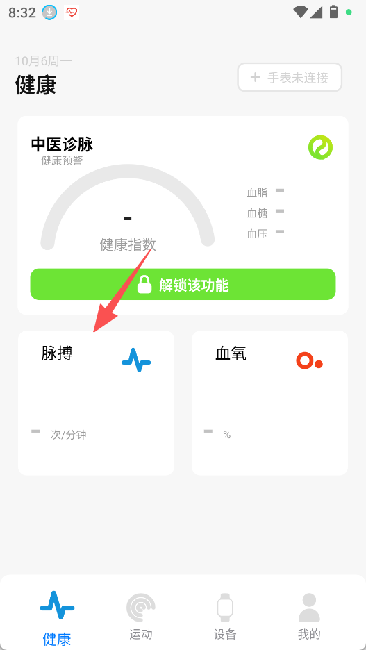 1、打开软件,进入健康板块,查看中医诊脉、脉搏、血氧等健康相关内容。