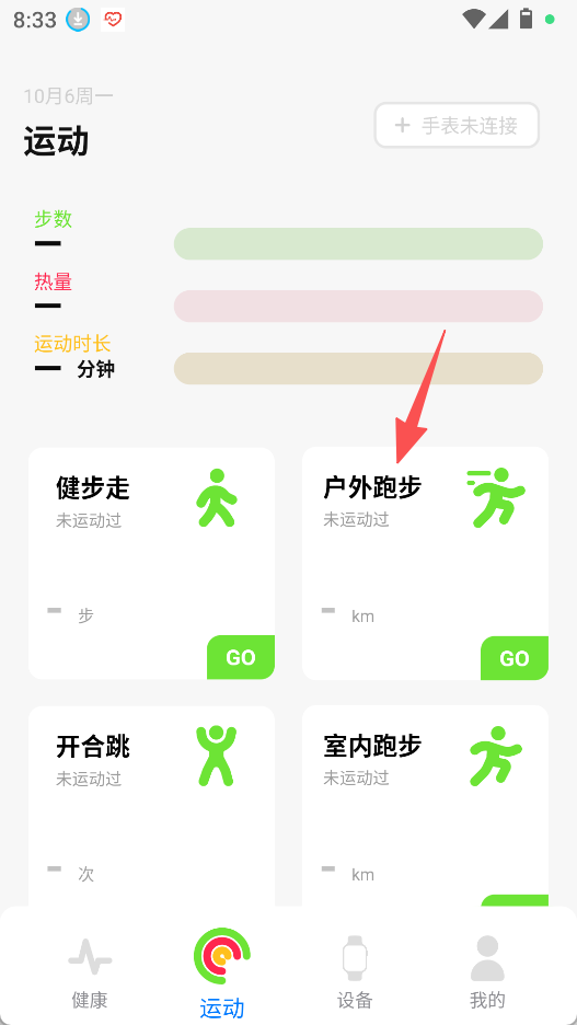 2、切换到运动板块,选择健步走、户外跑步等运动模式,记录运动数据。