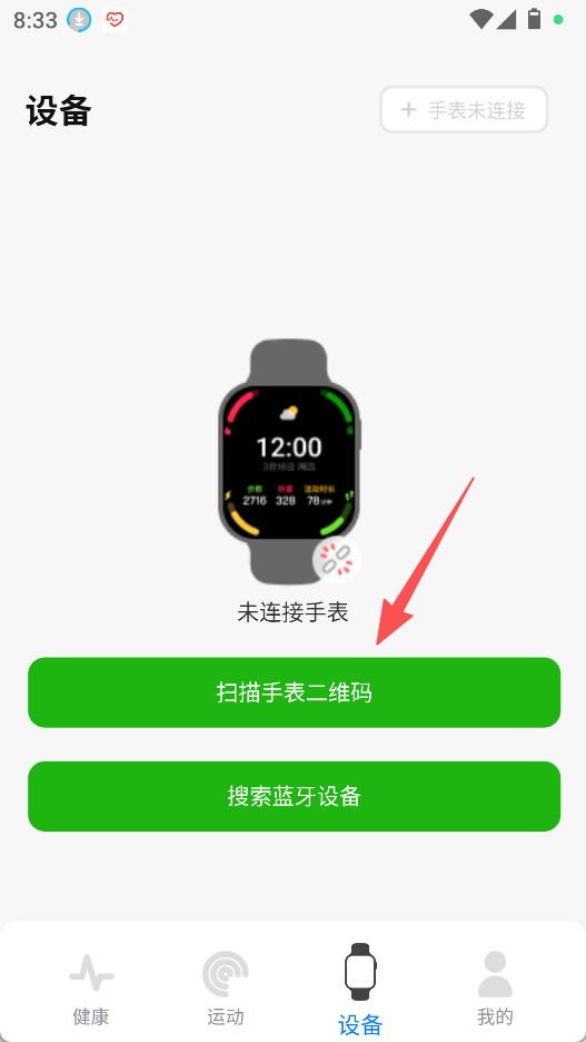 3、进入设备板块,通过扫描手表二维码或搜索蓝牙设备,连接手表。