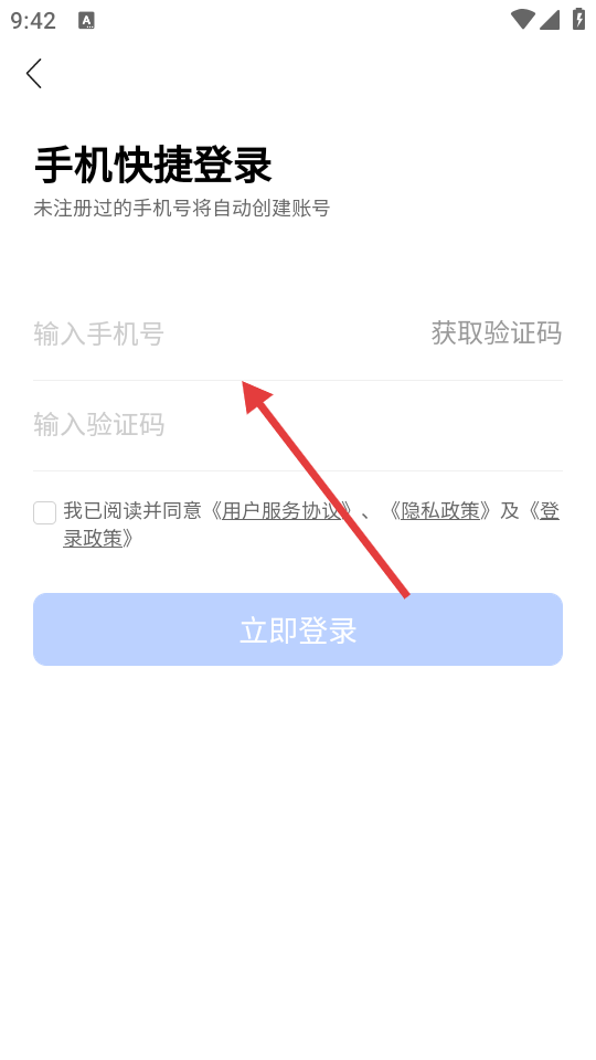 1、在【手机快捷登录】页面,输入手机号,获取并输入验证码,勾选协议后点【立即登录】。