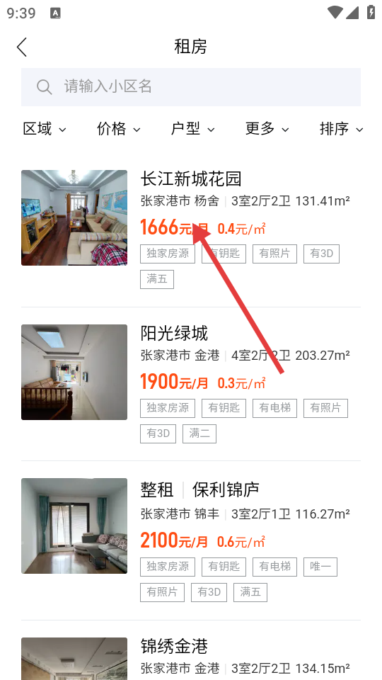 3、在租房页面,可浏览如【长江新城花园】等房源。