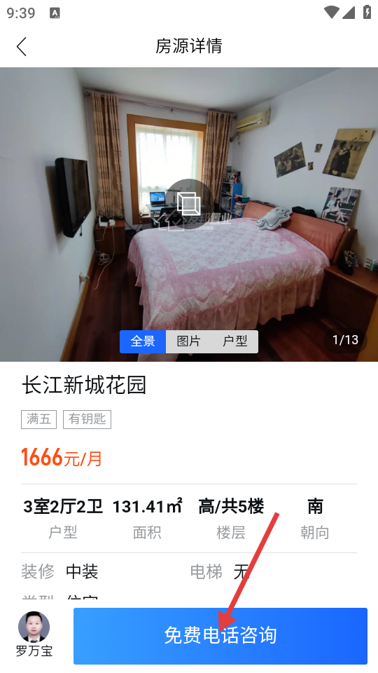 4、点击心仪房源,进入房源详情页,可点【免费电话咨询】进行联系。