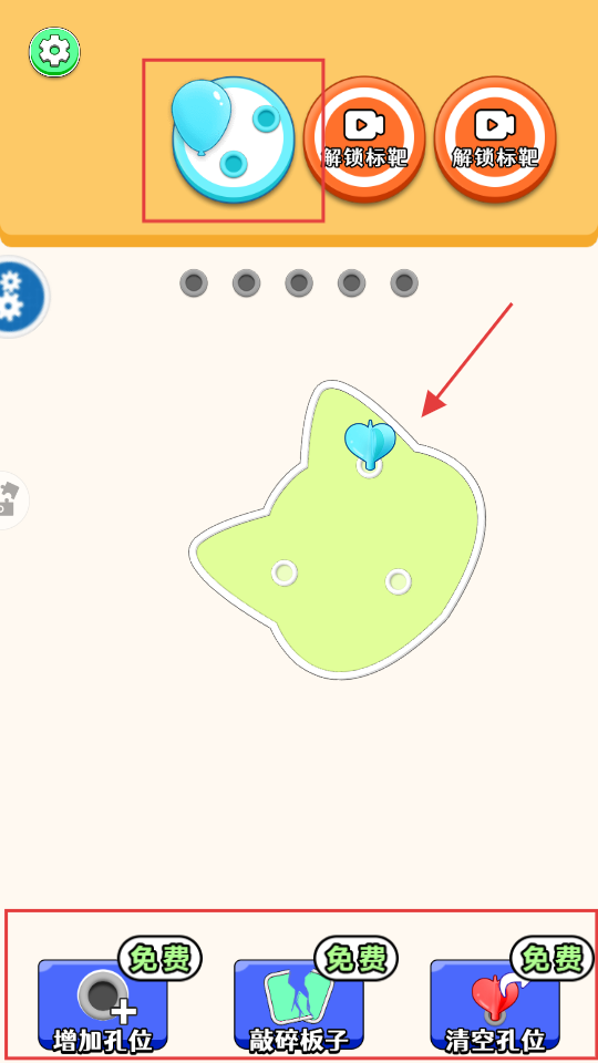 3、点击上方【橙色气球】图标,触发激光消除【橙色】螺丝,助力下方板块因失去螺丝支撑而掉落。