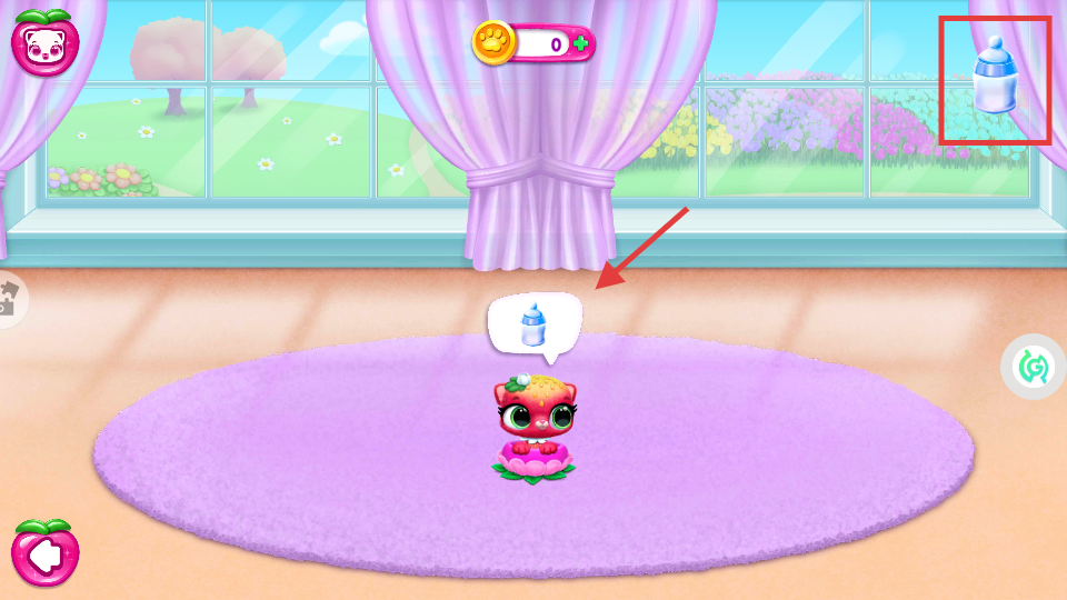 4、宠物孵化后,点击右上角【奶瓶】,满足喂养需求,维持心情值助力养成。