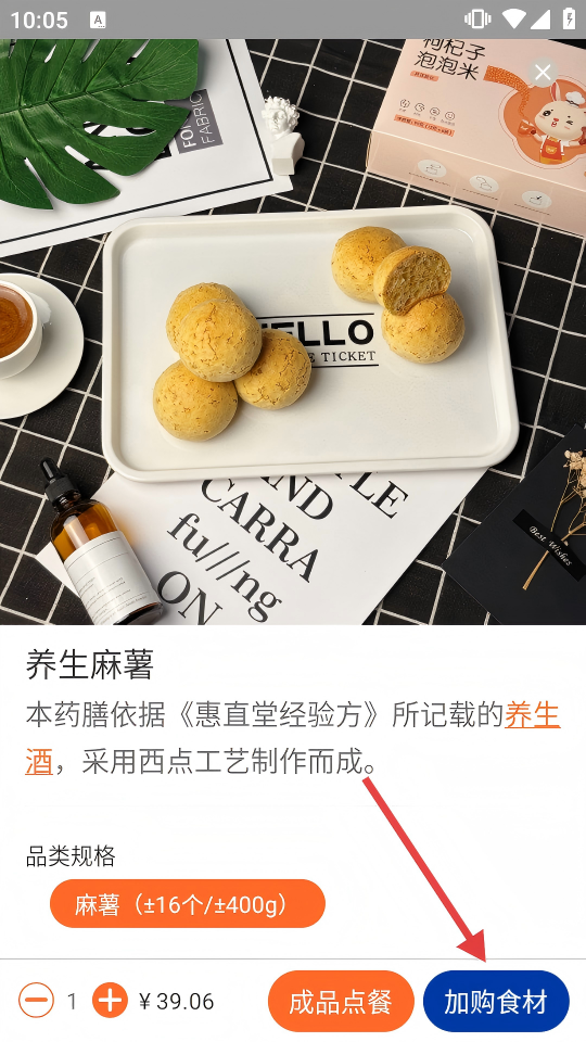 3、在养生麻薯详情页,点击【加购食材】按钮。