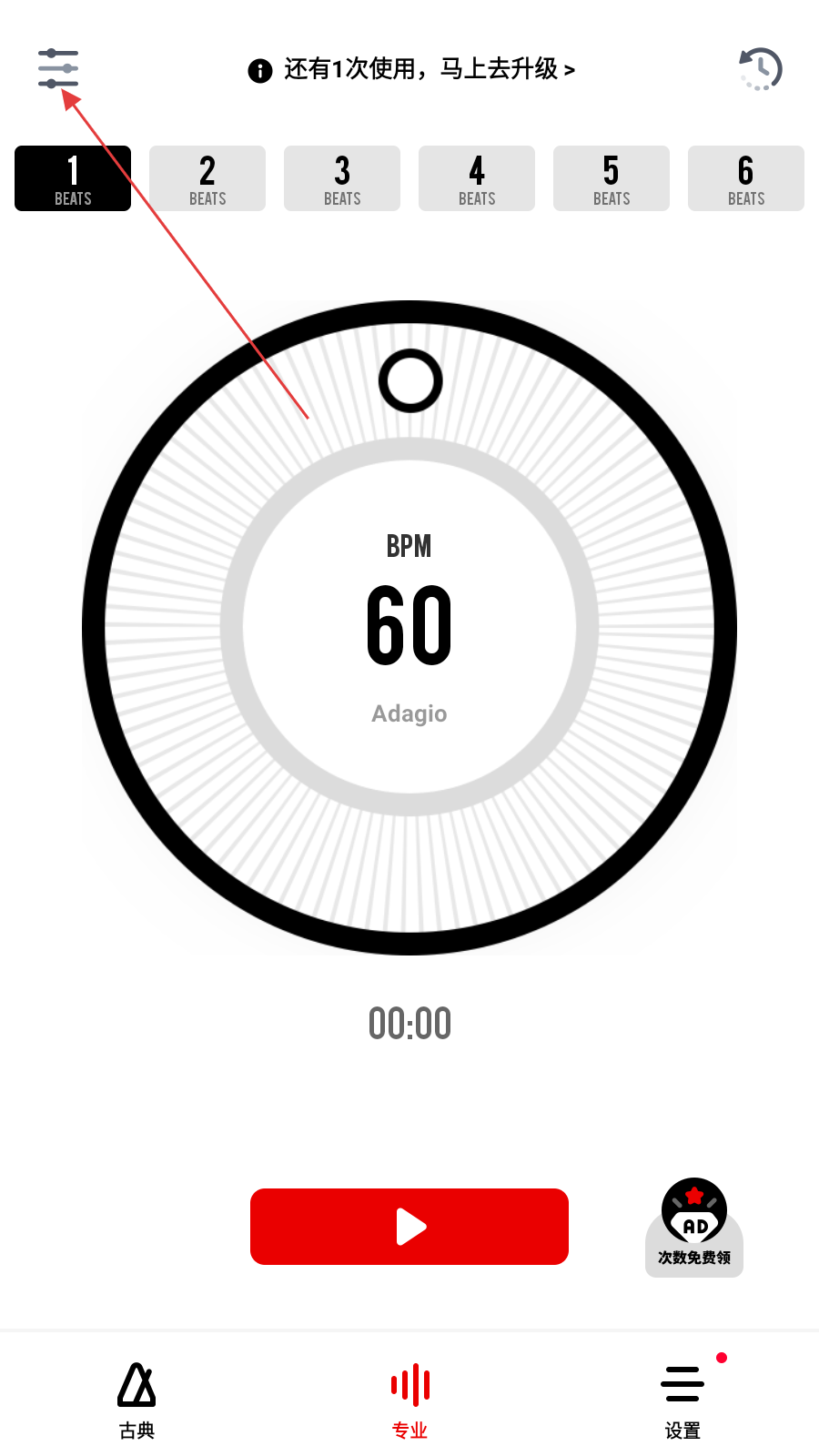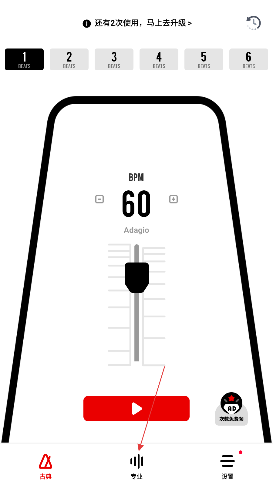 1、在古典模式的节拍器界面,点击底部【专业】,切换到专业模式的节拍器界面。