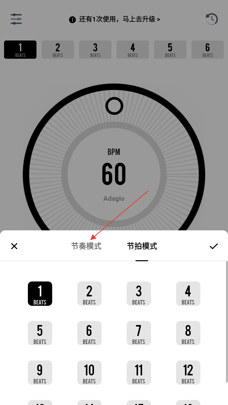 3、在弹出的模式选择弹窗中,点击【节奏模式】,进入节奏模式的节拍设置页面。