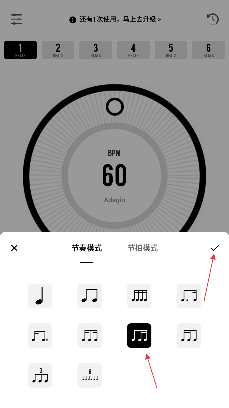 4、在节奏模式的节拍设置页面,选择好【节奏符号】后,点击【右上角的对勾】,即可确认节奏模式的设置。