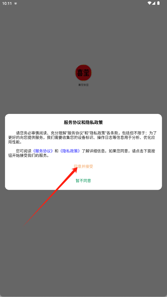 1、首次打开软件时在服务协议弹窗界面点击“同意并接受”按钮。