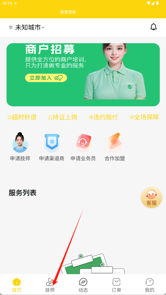 2、进入首页后在点击“技师”图标查看可用服务人员列表。