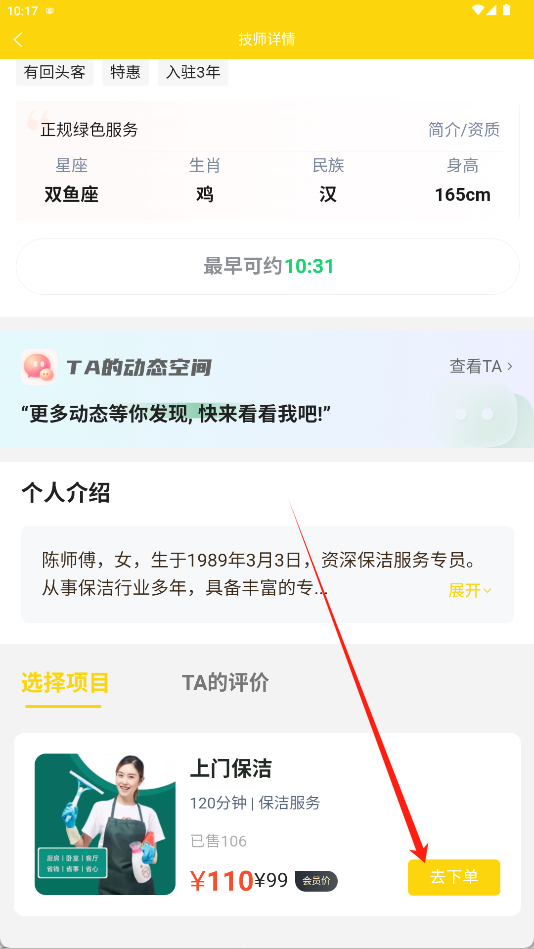 3、在详情页选择服务项目后点击“去下单”按钮即可预约指定技师上门服务。