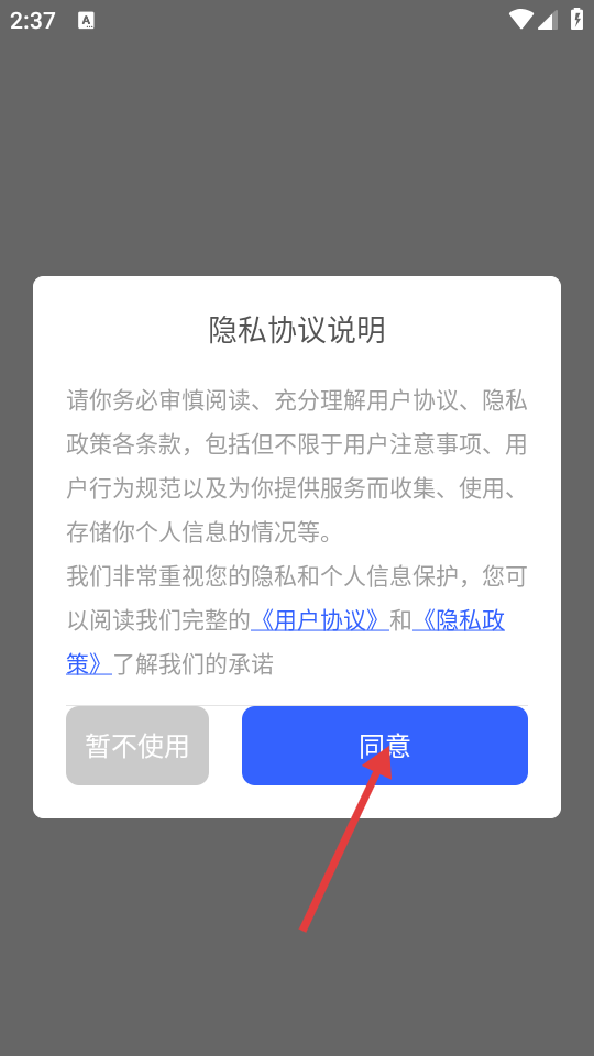 1、打开APP,在弹出的【隐私协议说明】弹窗中,点击【同意】。