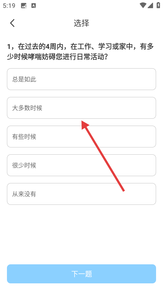 4、进入测试题页面,根据问题选择相应选项,完成后点击【下一题】继续测试。