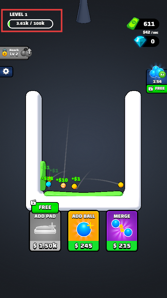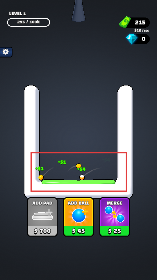 2、小球在绿色区域弹跳,获取金币,同时可根据需求,选择添加小球或合并等操作。