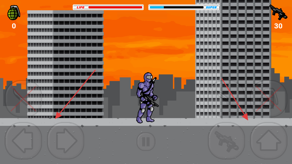 2、进入关卡后,操控左侧方向键移动紫色角色,右侧有武器攻击按钮,根据场景情况,向前方进行探索。