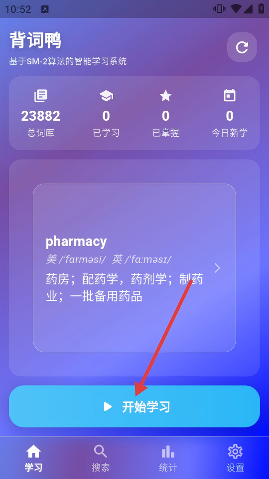 1、打开【背词鸭】APP,在学习页面点击【开始学习】,开启单词学习。