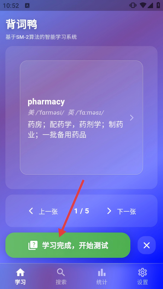 2、单词学习结束后,点击【学习完成,开始测试】,进入测试界面。